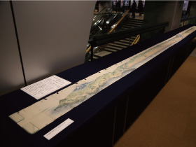 また、これら橋梁の図面類のほかに、庄内藩による江戸期の海岸植林の状況を示す約10mの長大な絵図も展示した(写真3)。これは、自然の脅威に対して長年対策が講じられてきた国土の姿を如実に示す貴重な資料である。 -