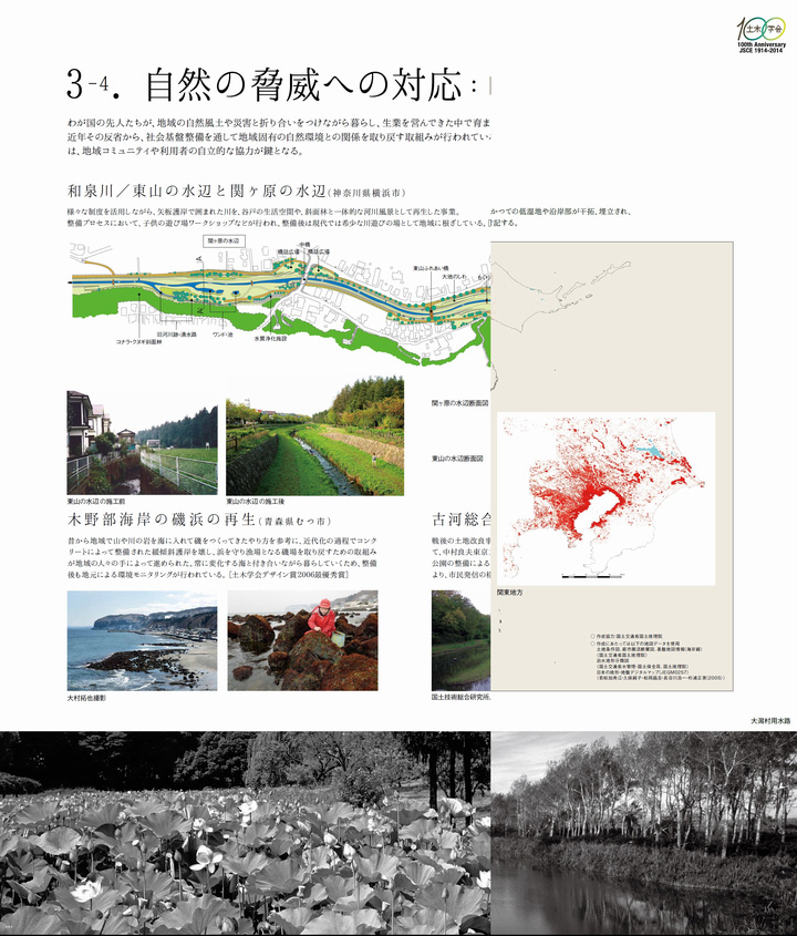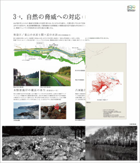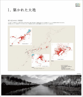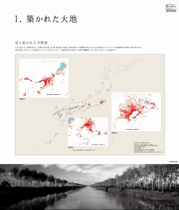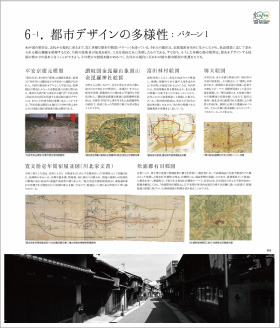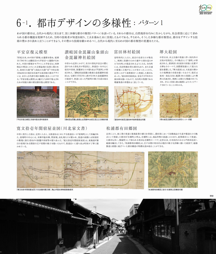 内容をかいつまんで説明すると、まず「1.築かれた大地」では、国土地理院の協力を得て、人口が集中する我が国の平野部において、低湿地や海面の干拓・埋立、台地の切土・盛土等の土木工事が大規模に行われてきた状況を示した(図1)。また「2.国土経営の手法」では、為政者たちのインフラ整備の考え方を示す図版の他、道路、河川、農地などが複合的に整備された状況を、「3.自然の脅威への対応」では、モノだけなく人の対応力も考慮に入れた近世のリスクマネジメントの手法、近代以降の科学的アプローチを踏まえた、現代の防災の多様な展開等を紹介した(図2)。「4.都市の再生」では、民間活力を導入して数々の危機を乗り越えた京都や、近年地域固有の資産を生かして再生しつつある地方都市を、さらに、「5.技術者の育成と学会の役割」では、一種の情報交換の場から、国家的、社会的課題の解決に寄与する組織へと変貌した工学会・土木学会の歴史を取りあげた。最後に、「6.都市デザインの多様性」と「7.橋梁デザインの多様性」では、自然地形を巧みに生かした都市デザイン(図3)と、日本の橋づくりの多様性を紹介して、日本の都市または技術者のDNAを探る糸口とした。