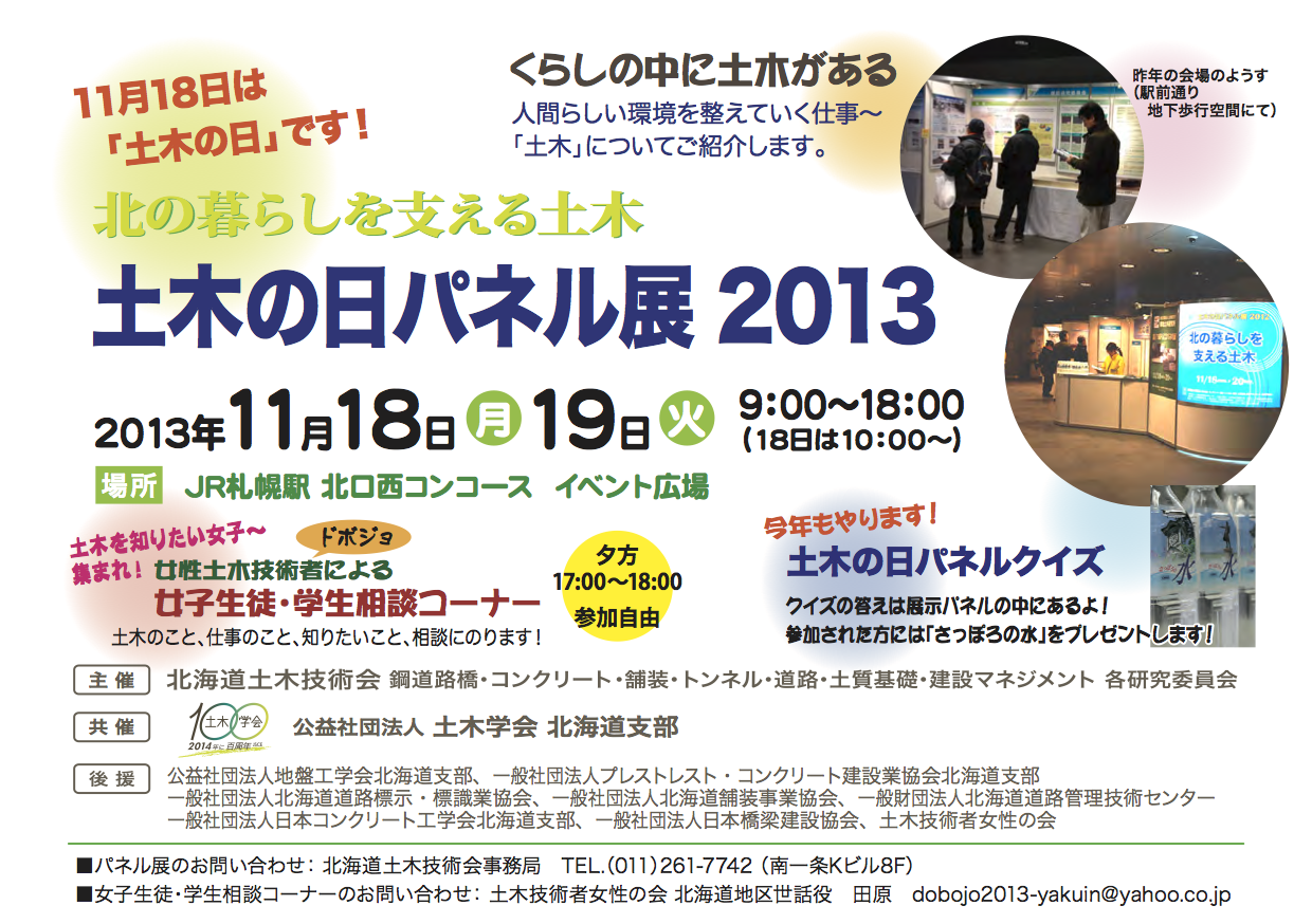 札幌で開催された「土木の日パネル展 2013」(主催:北海道土木技術会、共催:土木学会北海道支部)において、土木技術者女性の会の後援と協力により、初めて女子生徒・女子学生を対象とした相談コーナーが開催されました。