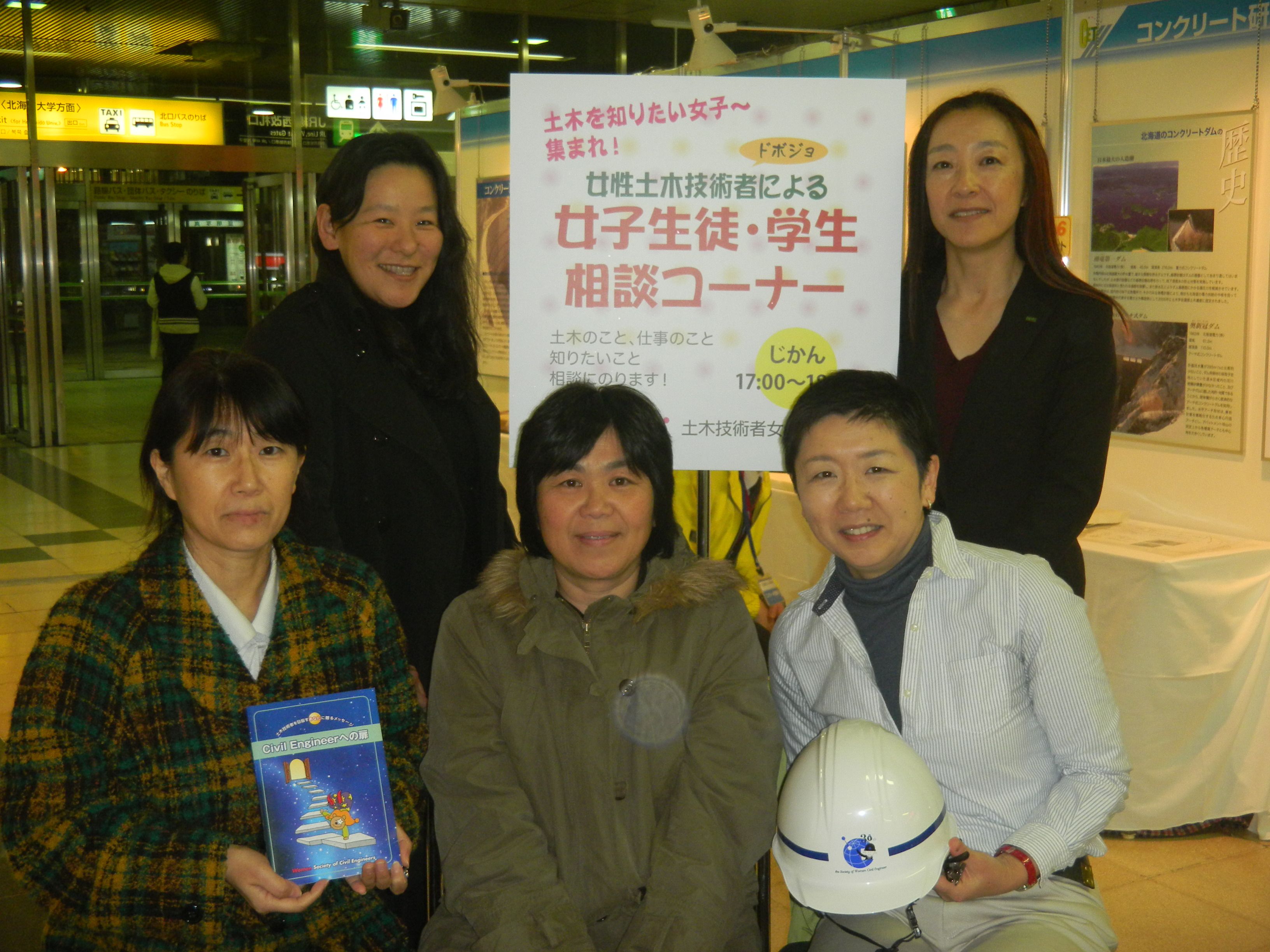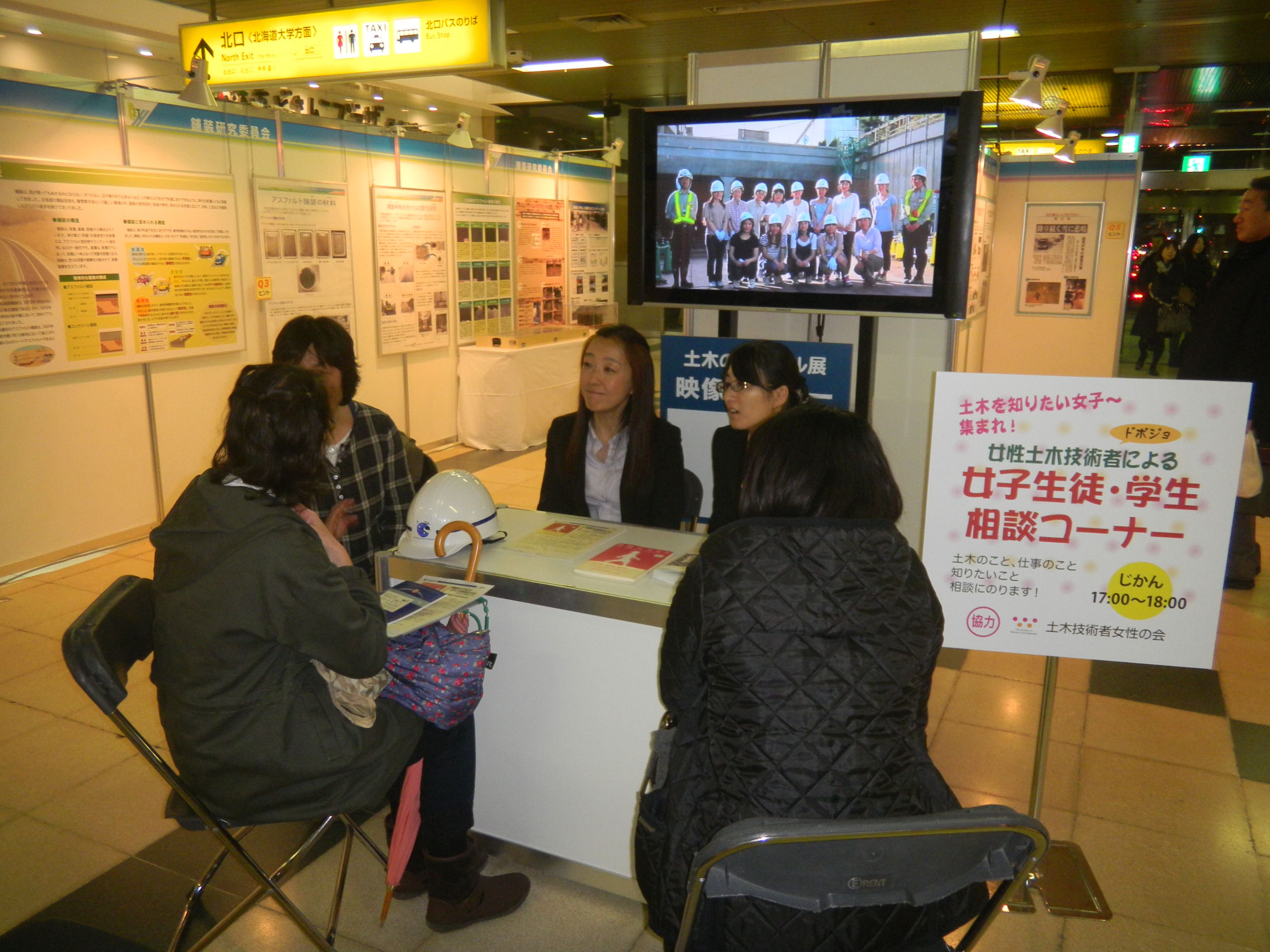 夕方の札幌駅コンコースの相談コーナーには6名の相談者が来場しました。「大学院進学と就職のどちらを選ぶべきだろうか」「土木技術者として働いていて、結婚や子育てはできるだろうか」「体力的に対応できるだろうか」などの不安に対し、相談員自身の経験を紹介しつつ、楽しく語り合いました。相談員となった土木技術者女性の会 北海道地区の会員の一人は「自分の学生時代を思い出しました。将来への悩みは、今も昔もあまり変わりませんね」と振り返っています。