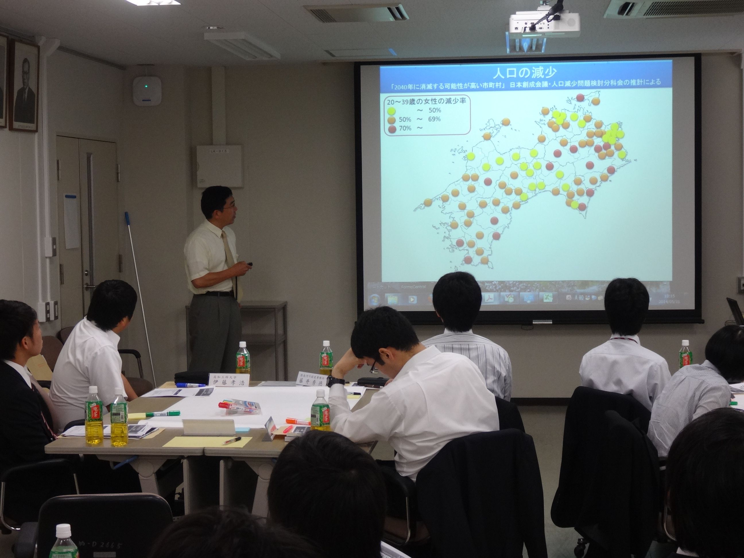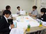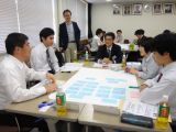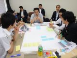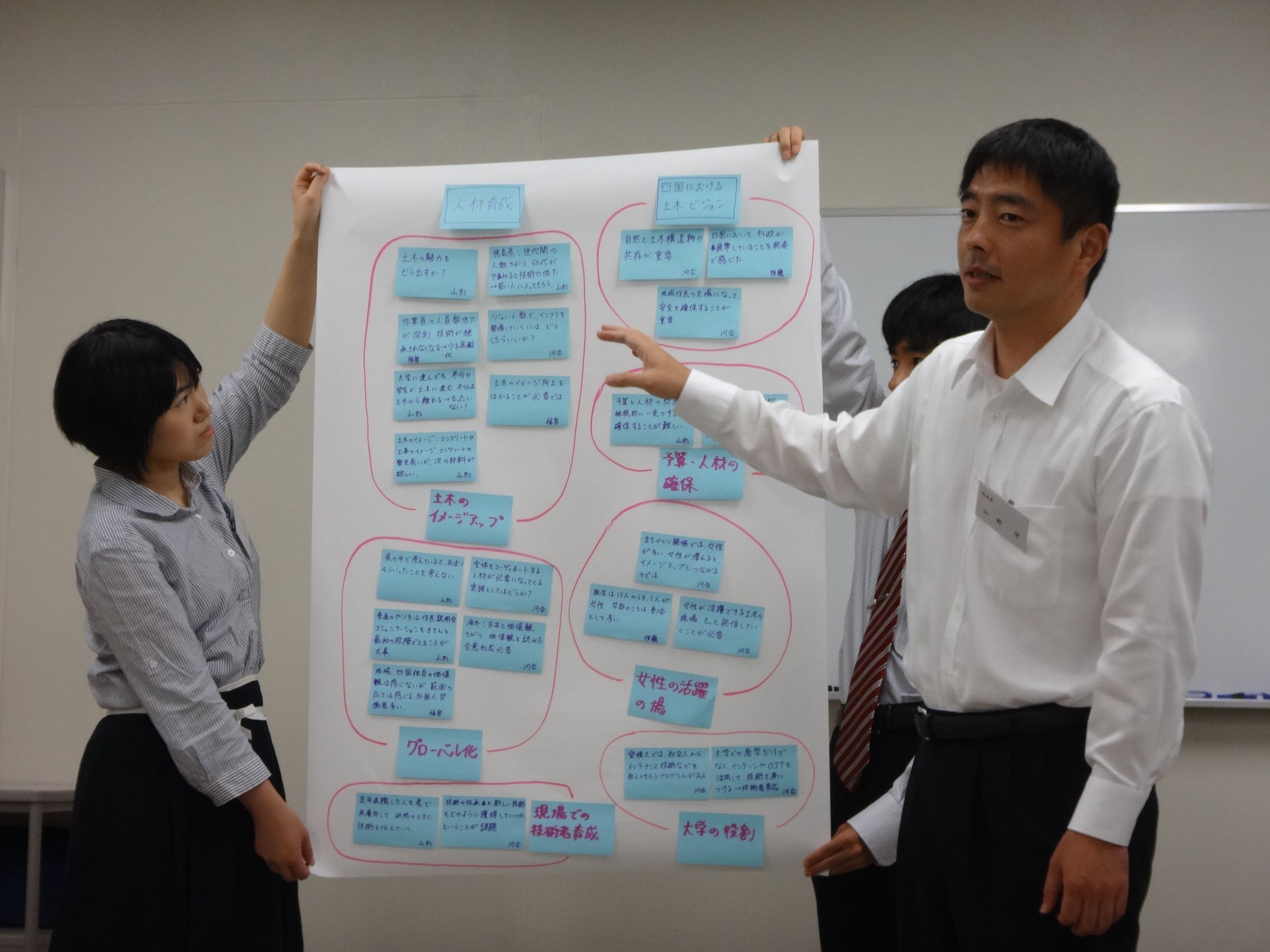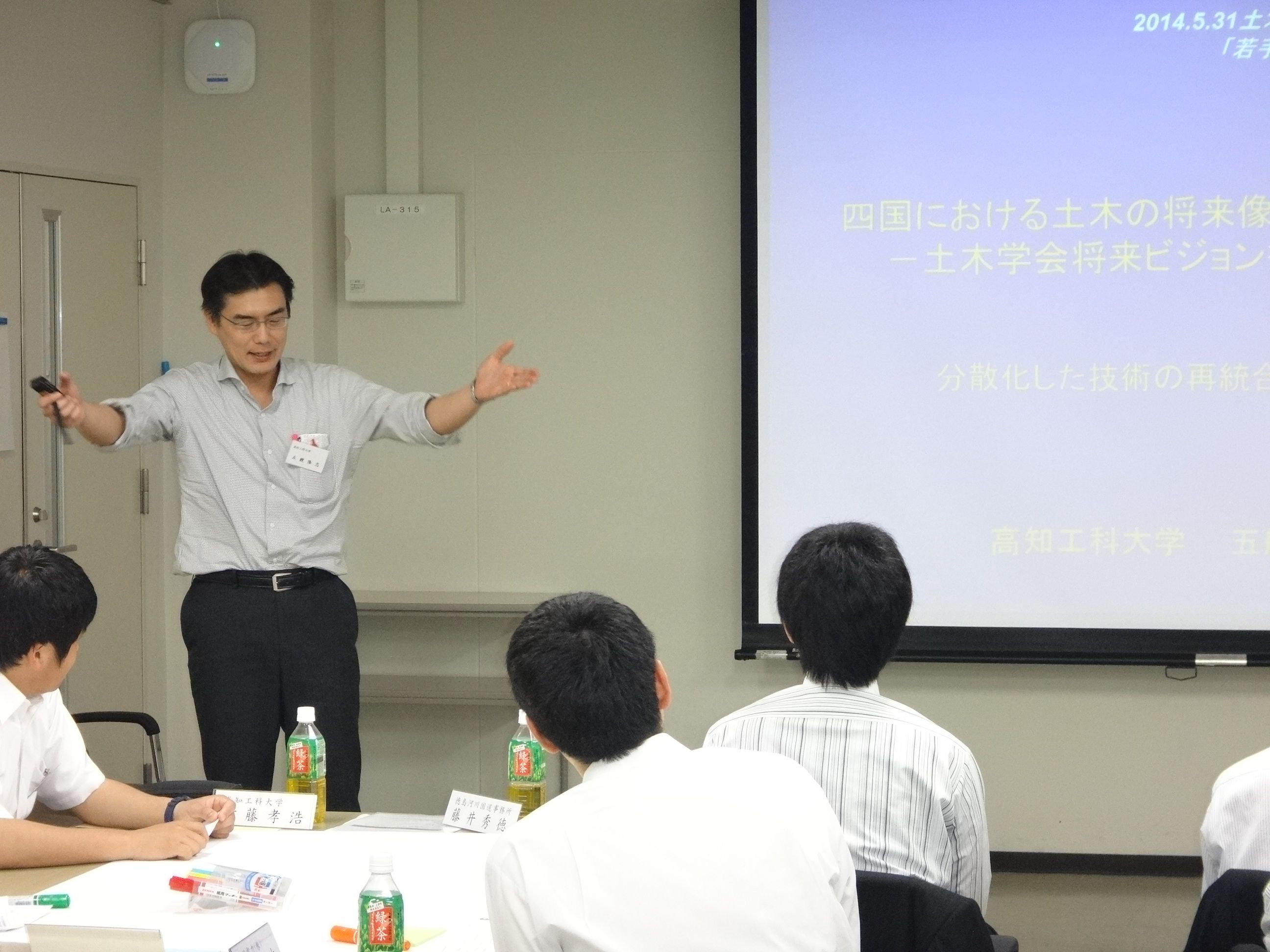 4名のファシリテータを含めて11名の若手技術者(20、30代各4名、40代3名)と9名(留学生、女子学生各1名)の大学院学生、合計20名の参加する中、最初に、「四国における土木の将来像と私たちの役割-土木学会将来ビジョンを踏まえて-」と題した4件の話題提供がなされました。次に、4班に分かれてワークショップ形式で議論し、それぞれの班における議論の概要や感想等が発表されました。その後、磯部雅彦次期土木学会長より、ワークショップの議論を各自が深めることに大いに参考となる総括とコメントが行われました。
