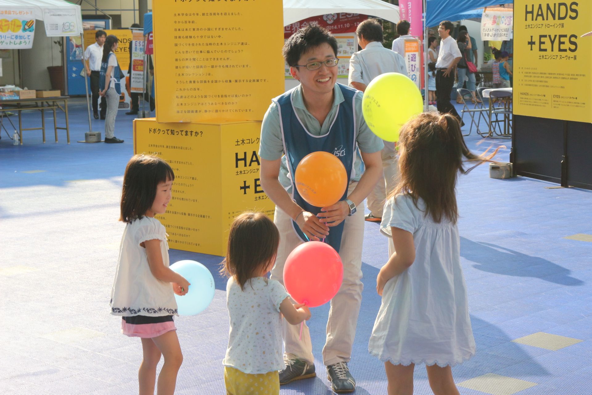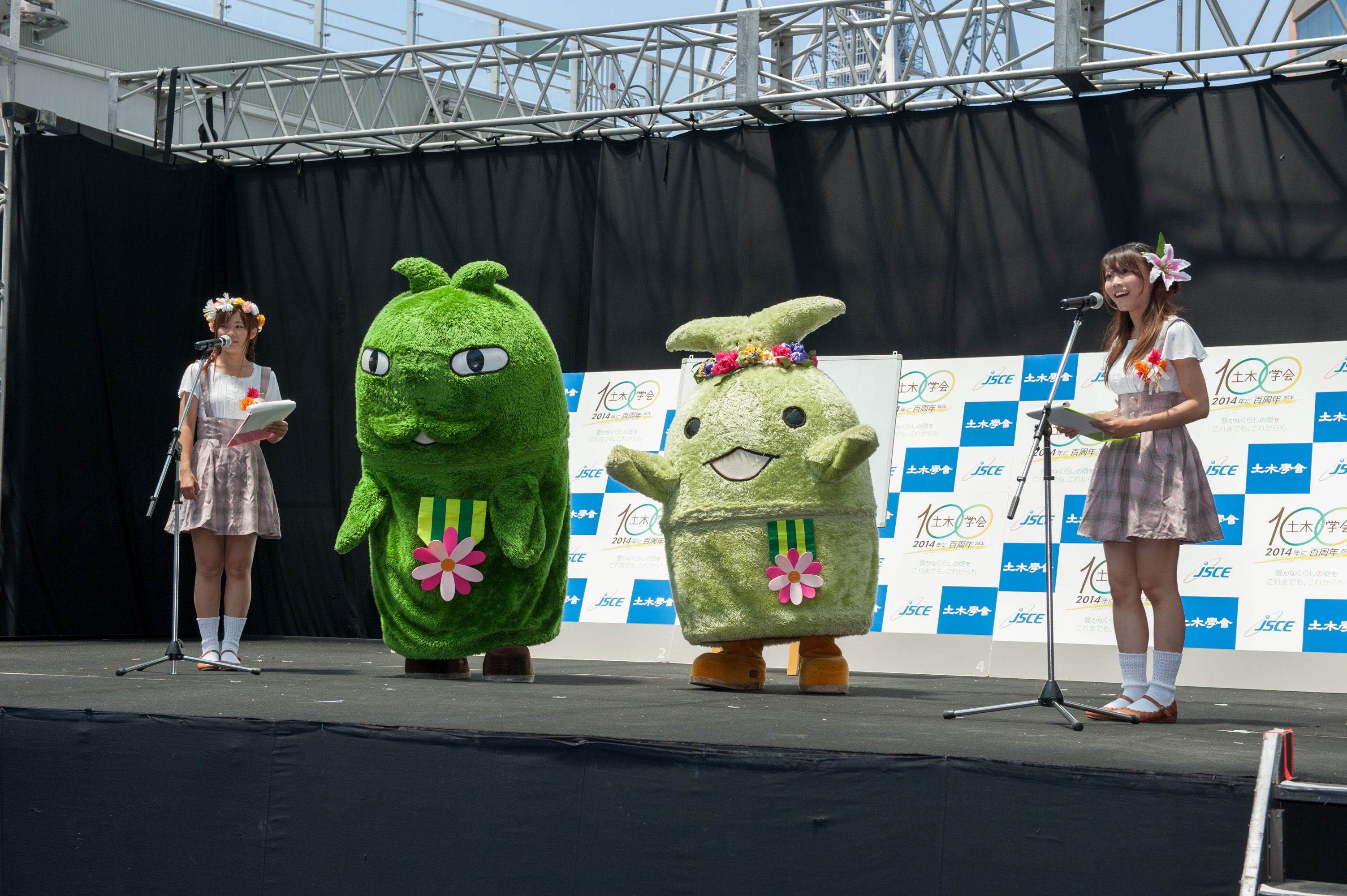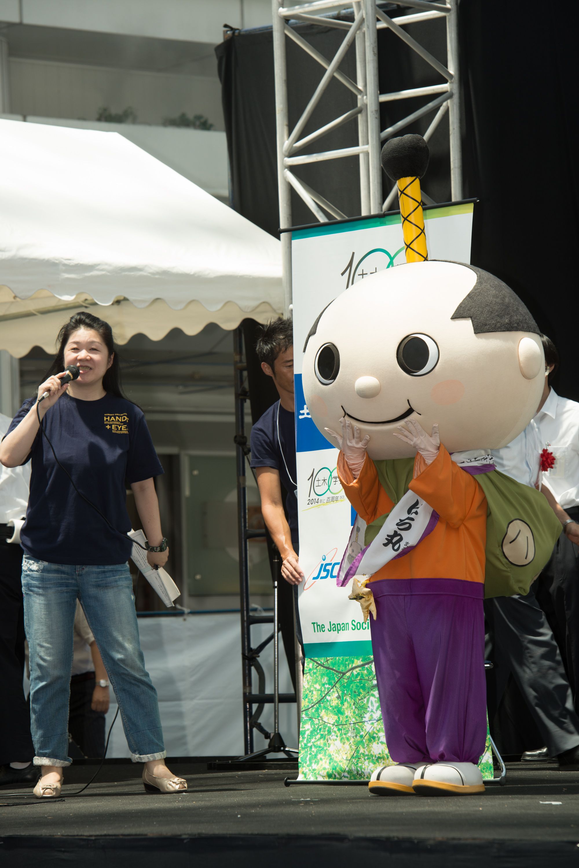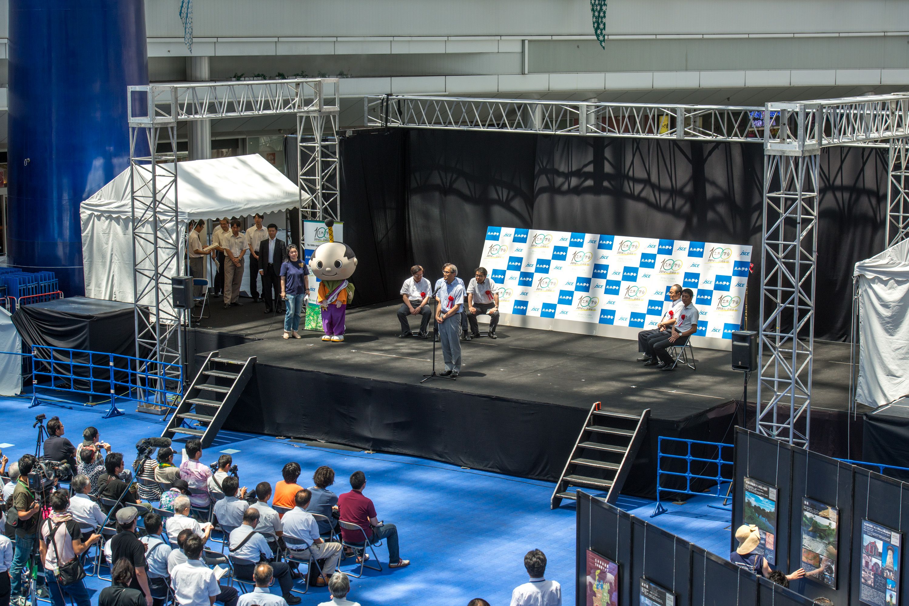 初日にはオープニングセレモニーを開催し、愛知県知事の大村秀章様、名古屋市長の河村たかし様、国土交通省中部地方整備局長の八鍬隆様よりお祝いの言葉を頂戴しました。主催者側として、公益社団法人土木学会会長の磯部雅彦、土木学会中部支部支部長の早川高明、土木学会100周年事業実行委員会市民交流部会部会長の島谷幸宏が出席しました。オープニングでは、ESD PRキッズユニット「sweet magic」&「ESD LOVE EARTH」によるパフォーマンスや緑化特別大使「モリゾー・キッコロ」によるステージも行われ、多くの方でにぎわいました。