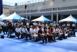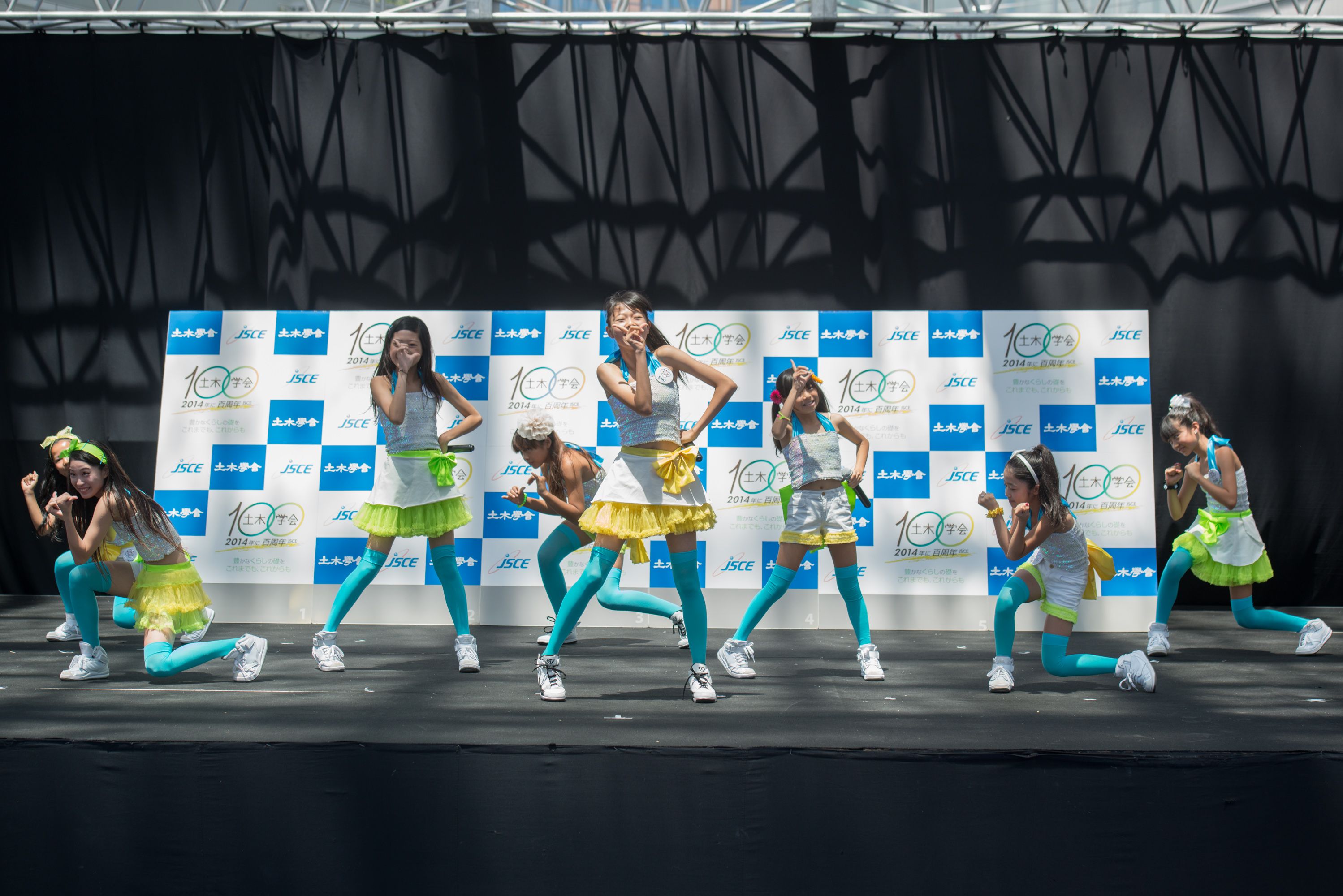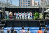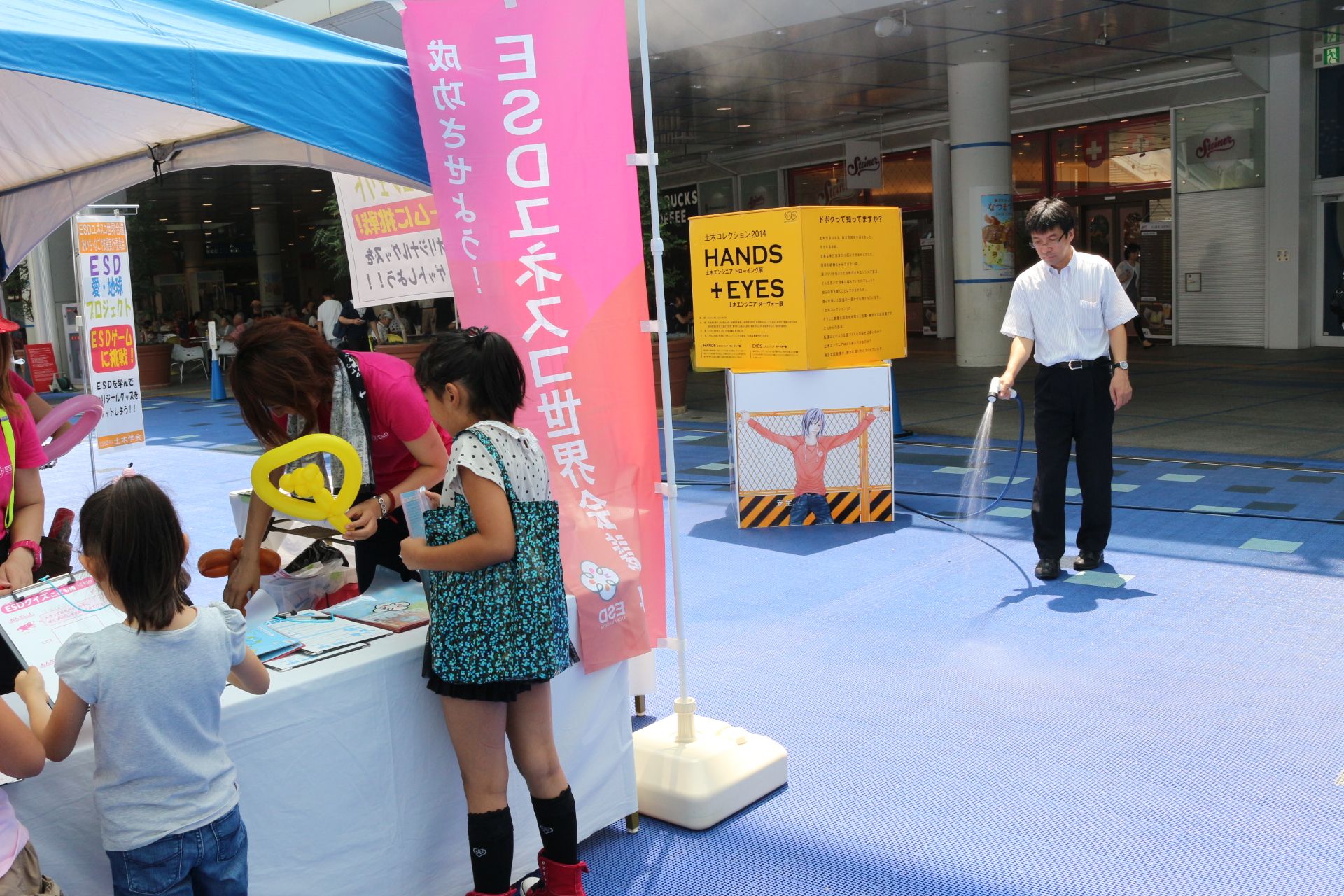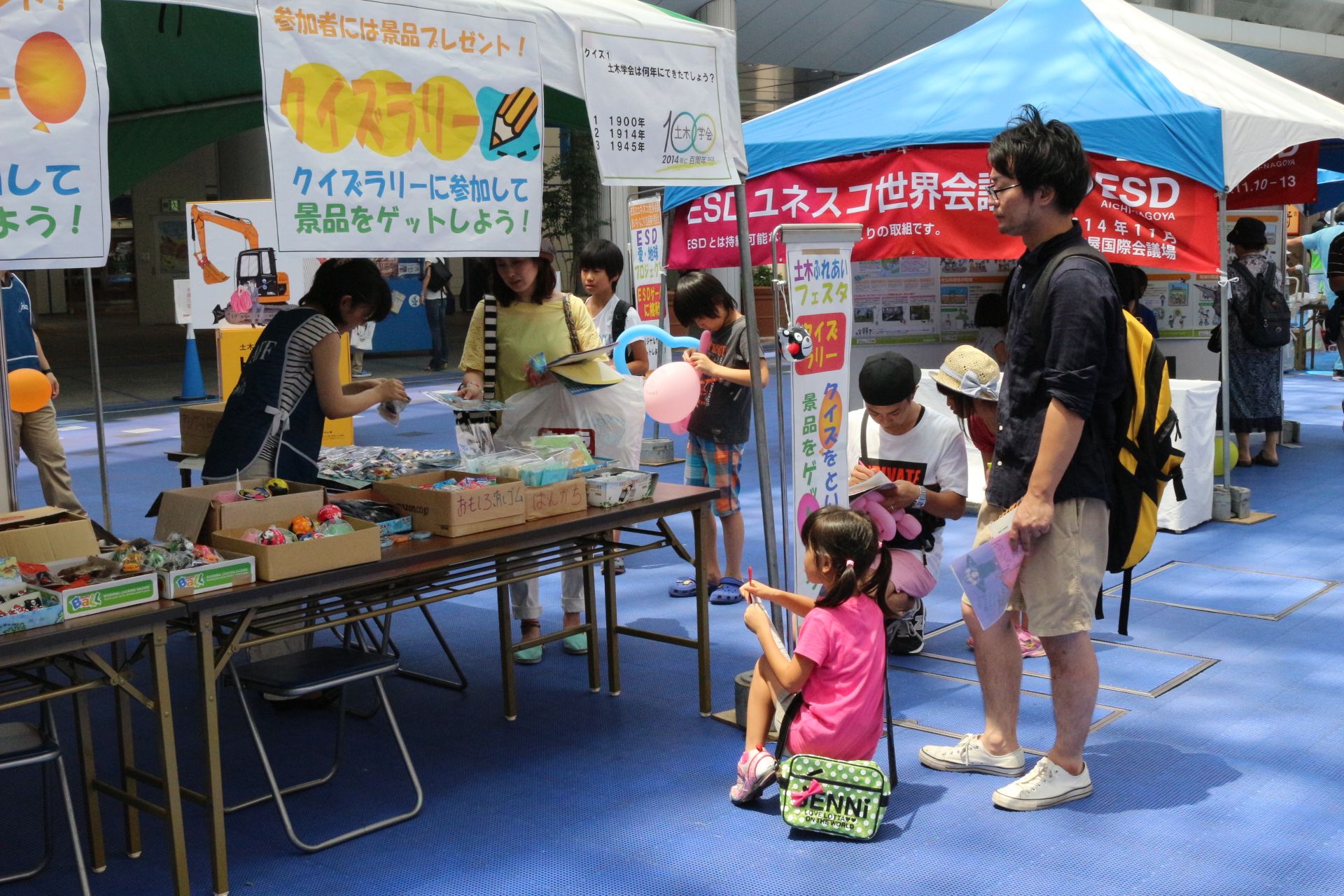 初日にはオープニングセレモニーを開催し、愛知県知事の大村秀章様、名古屋市長の河村たかし様、国土交通省中部地方整備局長の八鍬隆様よりお祝いの言葉を頂戴しました。主催者側として、公益社団法人土木学会会長の磯部雅彦、土木学会中部支部支部長の早川高明、土木学会100周年事業実行委員会市民交流部会部会長の島谷幸宏が出席しました。オープニングでは、ESD PRキッズユニット「sweet magic」&「ESD LOVE EARTH」によるパフォーマンスや緑化特別大使「モリゾー・キッコロ」によるステージも行われ、多くの方でにぎわいました。