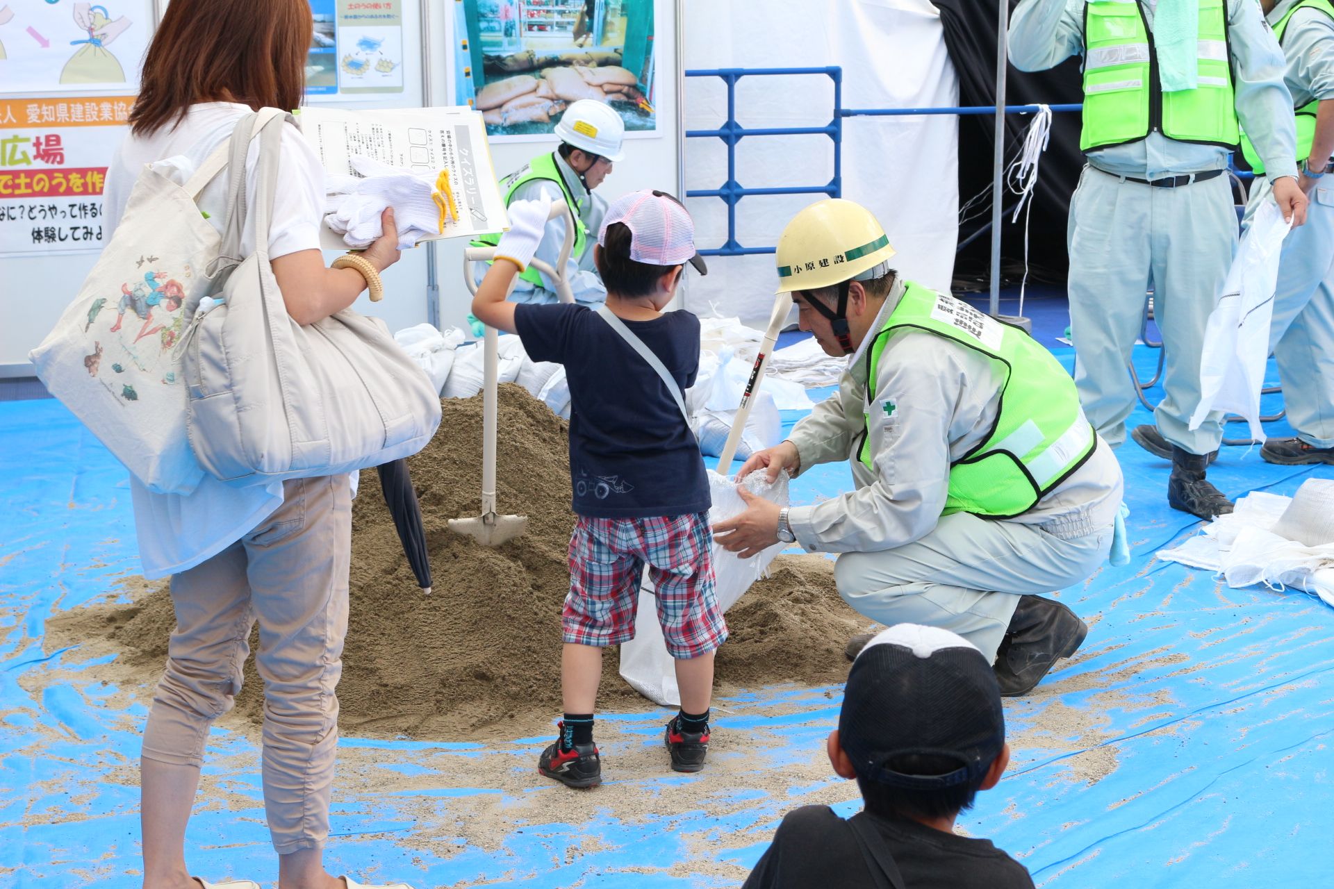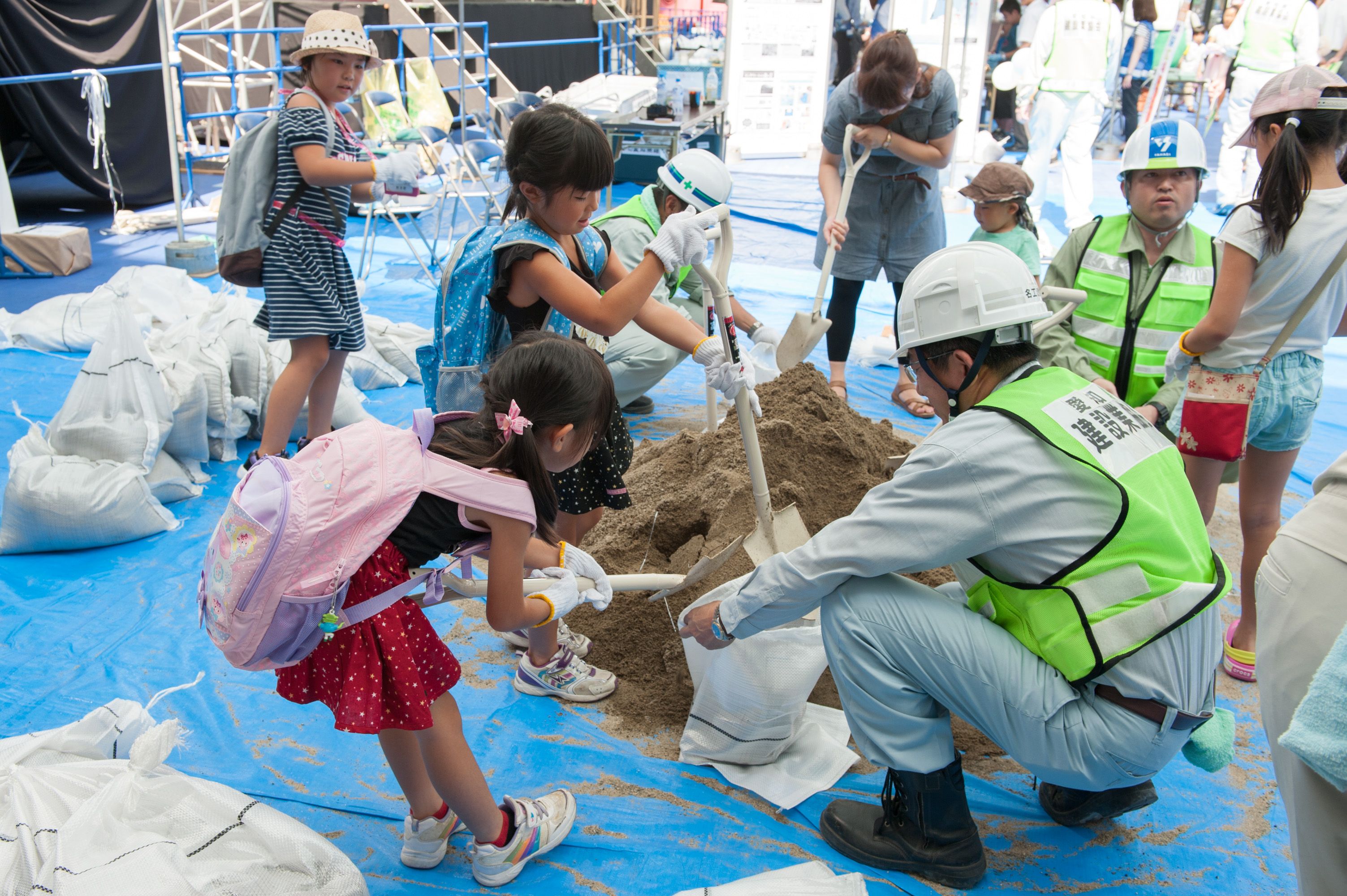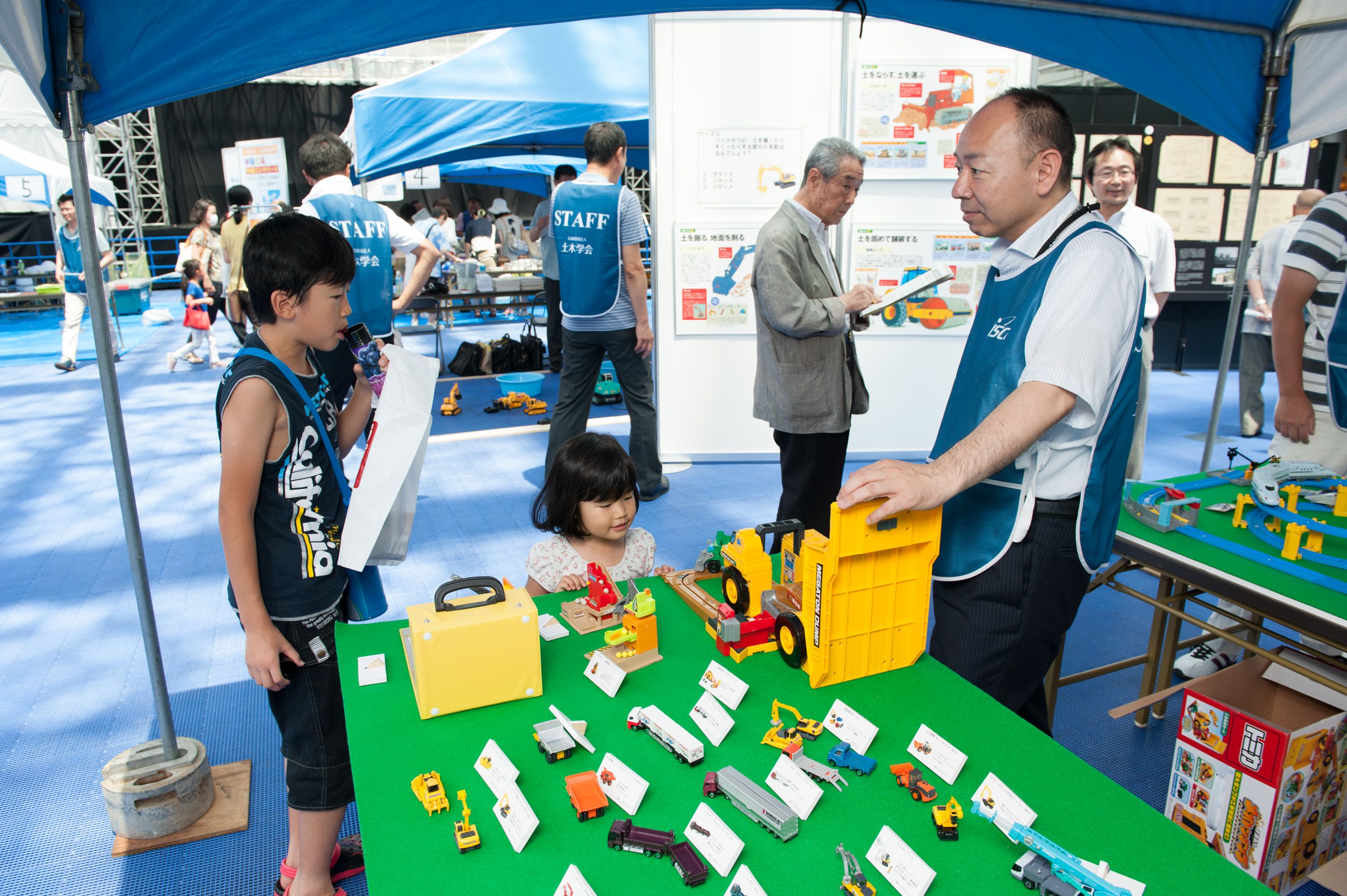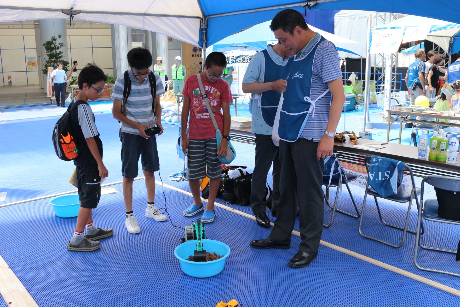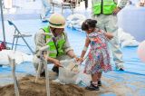 平日の開催でしたが、夏休みということもあって、「土木ふれあいフェスタ」コーナーでは、クイズラリーや体験広場を楽しむ親子連れの姿が多数見られました。「土のうづくり体験」や「はたらくくるま」コーナー、地震の液状化のしくみを学べるコーナー、など、子ども達は遊びを通じて目を輝かせて楽しく学んでいました。