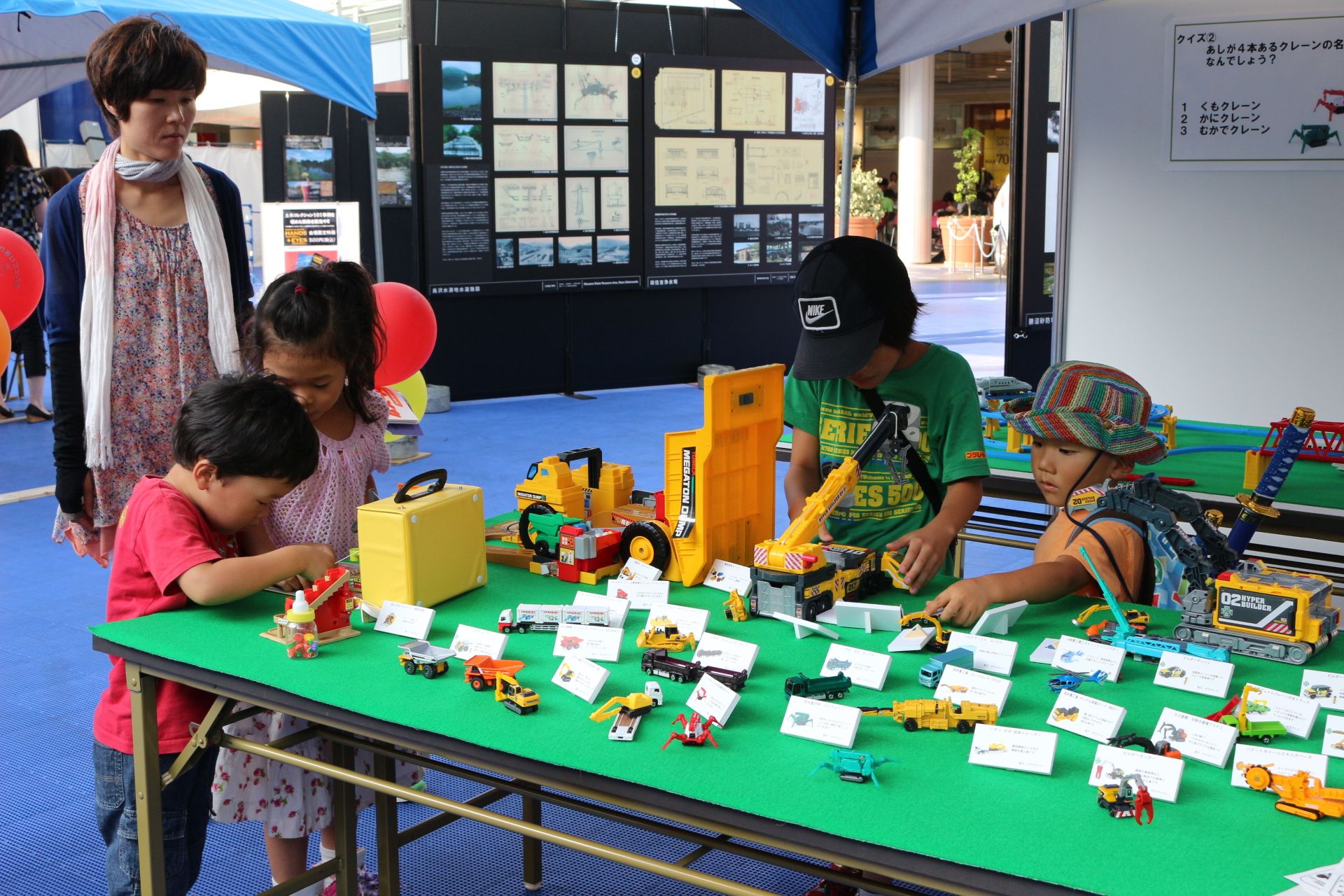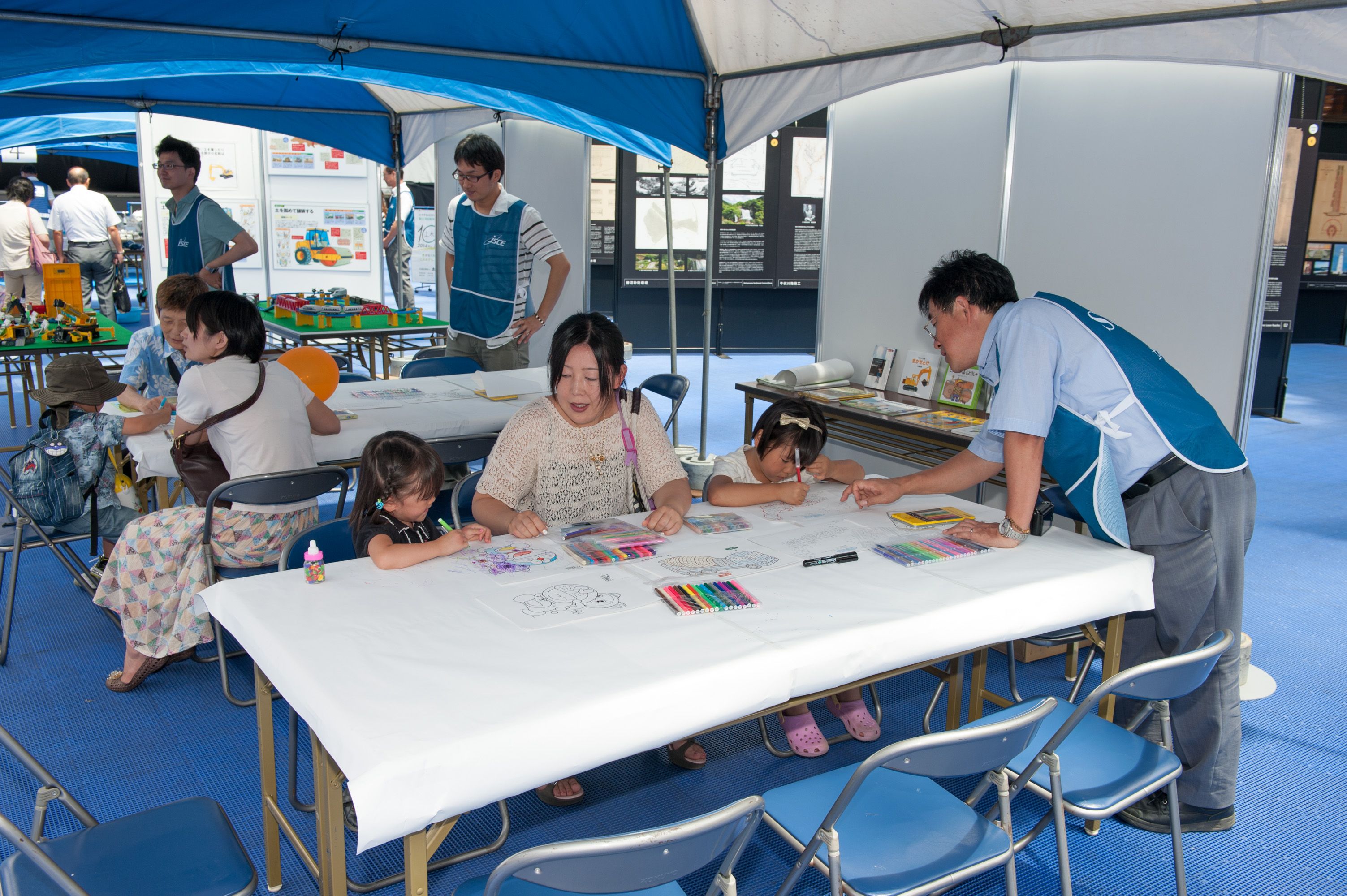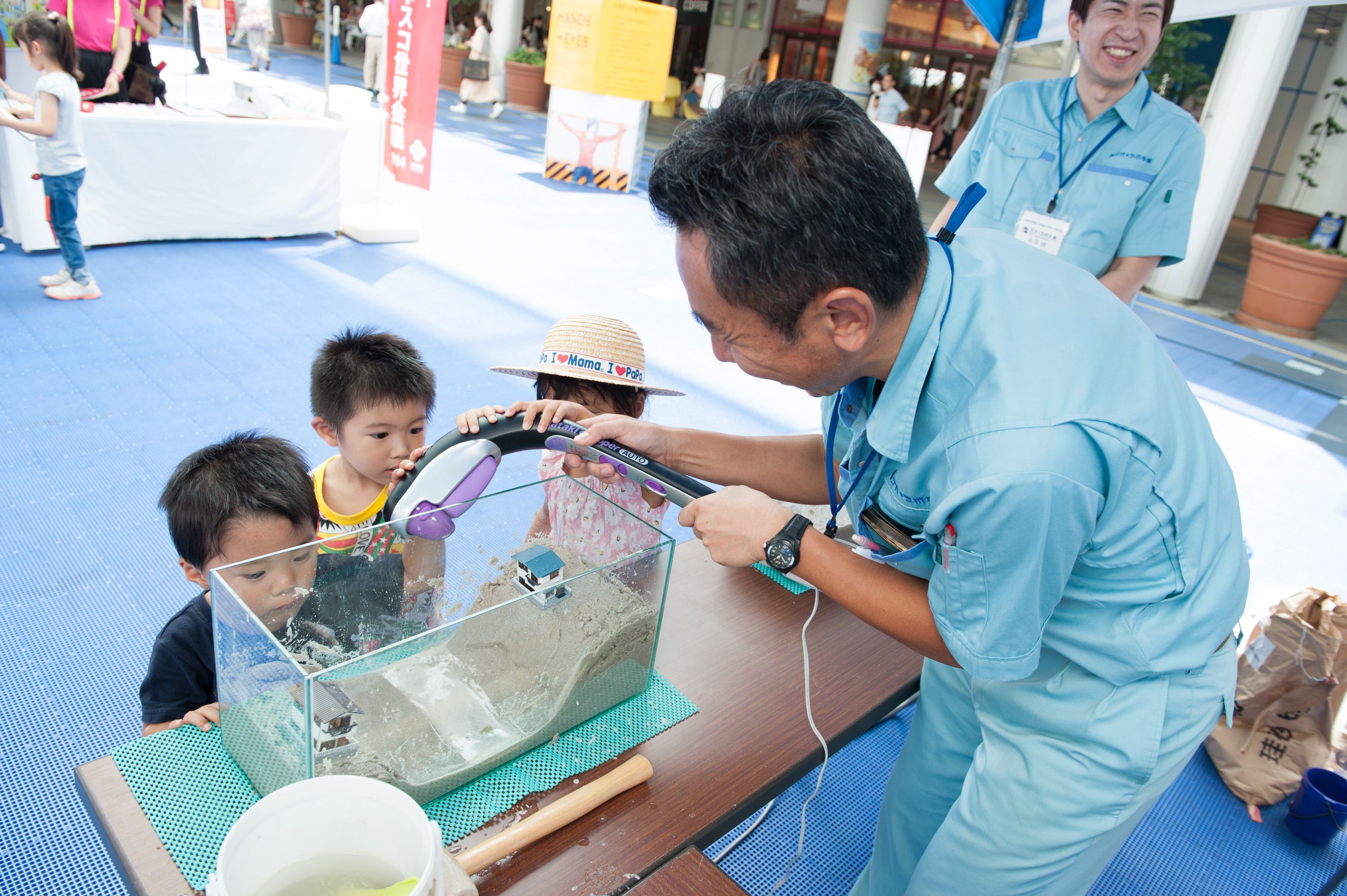 平日の開催でしたが、夏休みということもあって、「土木ふれあいフェスタ」コーナーでは、クイズラリーや体験広場を楽しむ親子連れの姿が多数見られました。「土のうづくり体験」や「はたらくくるま」コーナー、地震の液状化のしくみを学べるコーナー、など、子ども達は遊びを通じて目を輝かせて楽しく学んでいました。