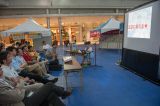 2日目の29日には18時から「どぼくカフェ」を開催しました。サイエンスライターの佐藤健太郎さんとタレントの山形みらいさん、兼岩孝さんをゲストに招き、「道が趣味」をテーマに土木について語り合いました。どぼくカフェが始まると、「何をやっているんだろう」と道行く方々が立ち止まり、そこに出現したのはまさしく“土木的なるもの”。一般の方も交え、大盛況のうちに終了しました。