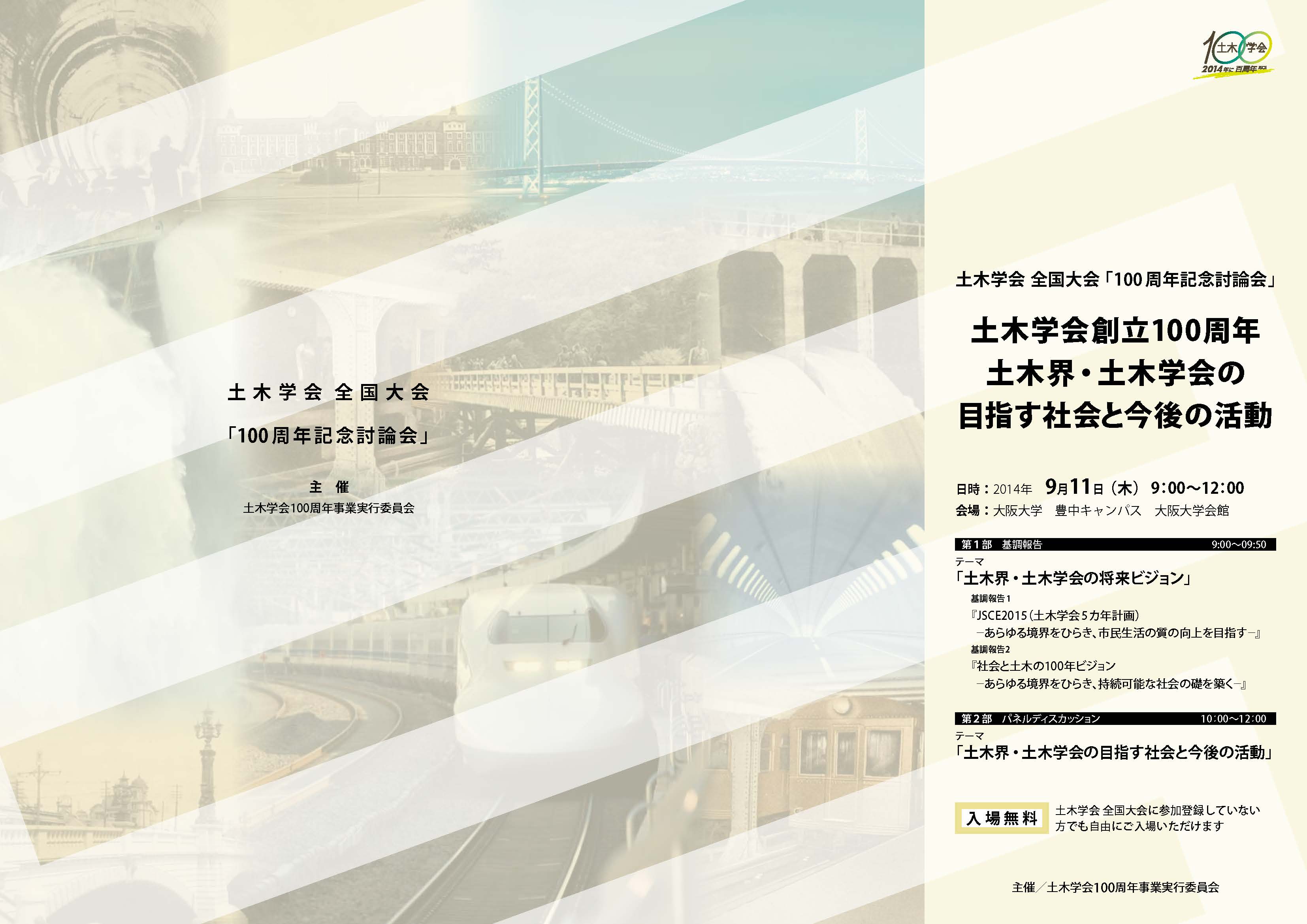 本年(2014 年)11 月24日に、公益社団法人土木学会は創立100 周年を迎えます。この100 年の間、わが国をとりまく環境は大きく変化し、土木界・土木学会に求められる社会的な要請もまた大きく変化してきています。土木学会は、100周年を迎えるにあたり、この変化の中で、これからの土木が何をビジョンとし、何をすべきかを考え、また、その結果を行動につなげていくために、「100周年記念討論会」を全国大会において開催しています。土木学会の全国大会は、全国から延べ2 万人を超える人が集まる大きな大会であり、会員間の意見交換や情報共有を行う絶好の機会となっています。この機会を活かし、2010 年度には『「土木」の原点と100 周年』、2011 年度には『市民工学への回帰』、2012 年度には『土木界・土木学会は,これまで何をしてきたか,これから何をすべきか』、2013年度には『次の100 年に向けて土木技術者の果たす役割とは』というテーマで議論を行ってきました。本年度は、これまでの集大成として『土木学会創立100 周年:土木界・土木学会の目指す社会と今後の活動』というテーマを掲げ、土木界・土木学会が目指す社会と今後の活動について他分野の技術者とともに語りあう討論会を開催します。