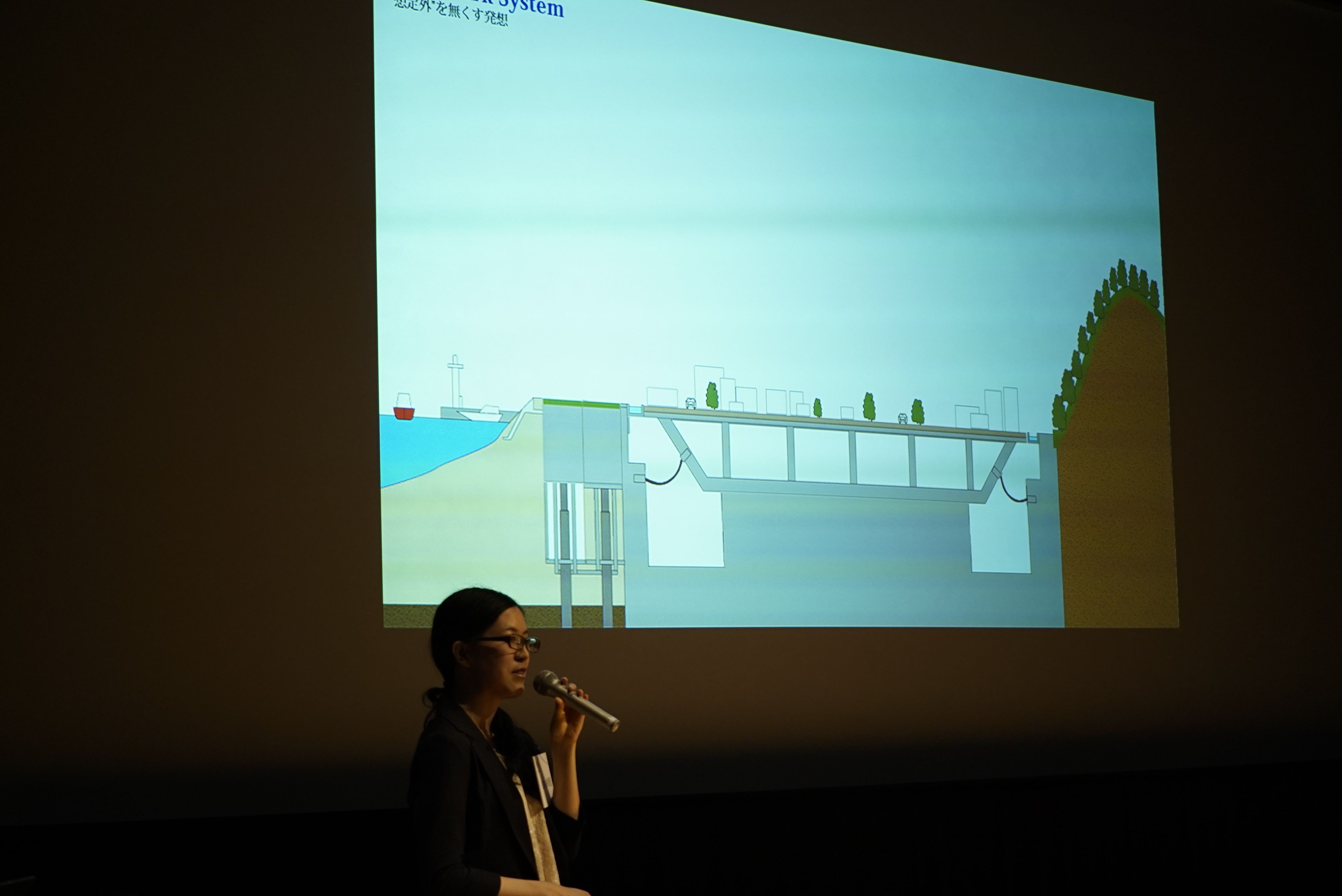 広く募集したのは「自分たちが実現したい未来の社会」のアイディアと、それを実現するための技術的検討、開発すべき技術提案。未来を創造する、土木の企画力・実行力・総合力すべてを兼ね備えた土木の迫力を問うことを目的に募集したところ、全国から47件の応募があり、一次選考で5チームが最終選考会に進みました。当日は、唯一の学生チームと、社会人チームが工夫をこらしたプレゼンテーションを行いました。