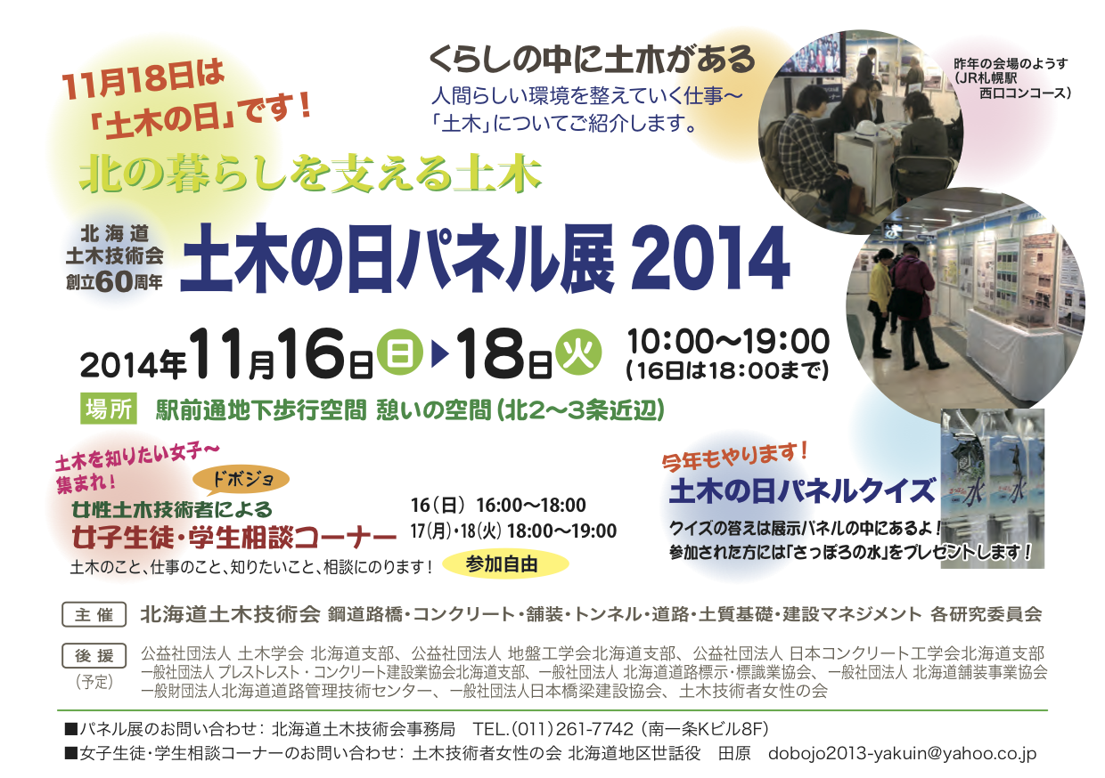 土木学会北海道支部では、土木の日パネル展 2014(主催:北海道土木技術会)を後援します。