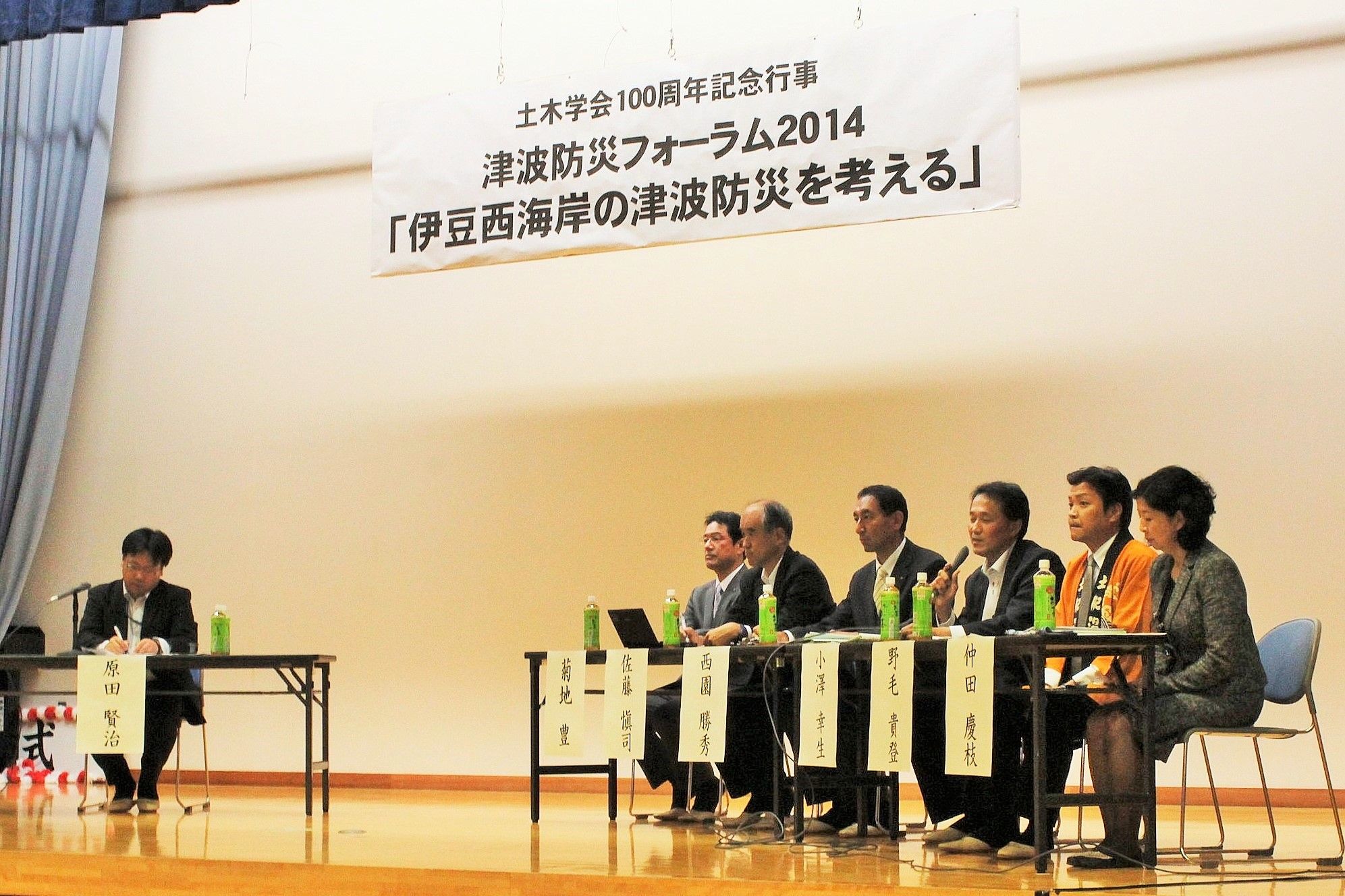 午前中に歴史津波の痕跡などを視察した後、午後に開催した津波防災フォーラム2014には、市民や消防署員など約300名が参加され、土木学会海岸工学委員長である佐藤愼司教授(東京大学)による基調講演や、静岡県交通基盤部港湾局長の西園勝秀氏による伊豆半島の津波防災対策に関する報告、さらに、6名のパネリストを迎えたパネルディスカッションが行われました。パネルディスカッションには、原田賢治准教授(静岡大学)司会のもと、伊豆市長や土肥温泉旅館協同組合専務理事なども参加され、堤防を中心としたハード整備と避難などのソフト対策をどのように連携させていくか、また、景観に配慮した海岸堤防の整備や、観光客の避難誘導など、防災と観光産業の両立をどのように図っていくかといった議題について、それぞれが意見を出し合い、堤防を地域の財産とする津波防災対策のあり方について議論されました。