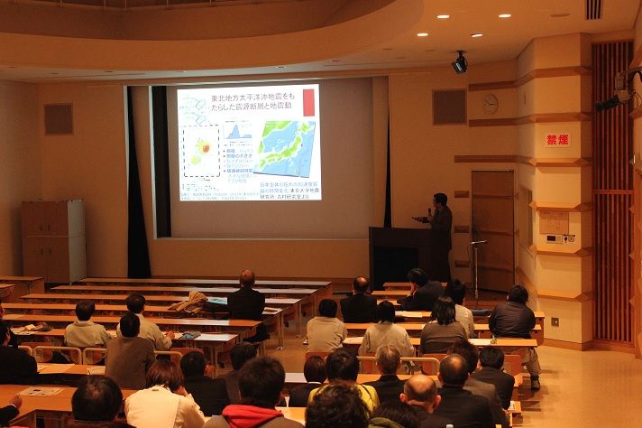 東日本大震災後に設置された「東日本大震災に関する東北支部学術合同調査委員会」の主催による報告会「2011年東北地方太平洋沖地震-被害に学ぶ,課題と対策-」が12月12日(金)に日本大学工学部にて、日本大学工学部・私立大学戦略的研究基盤形成事業「福島県発の災害に強く自立共生が可能な住環境の創成に関する研究」グループの共催により開催しました。この報告会の目的は、東日本大震災に関する東北支部学術合同調査委員会が報告書に取りまとめた被害データより何を学んだか、つまり被害の分析より社会の安全に及ぼす課題を抽出し、その対策として必要な技術などについて報告することにあります。