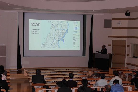 報告会に参加された方々は建設技術者や学生を中心とする約50名で、講演者の報告に皆真剣に聞き入っていました。東日本大震災を振り返り、復興に向けた取り組みの足掛かりとなる機会を提供することは有意義なこととのご意見もいただくことができ、遅れている福島県の復興を促進するための契機となれば幸いです。