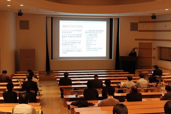 報告は合同調査委員会に設置された第一部門から第三部門について実施され、日本大学・中村晋教授による「地震・地震動 -特に、福島県の地震動の特徴と課題-」から、日本大学・岩城一郎教授による「社会基盤施設の被害の特徴と対策」、東北大学大学院・真野明教授による「津波による被害、その特徴と対策」、最後に日本大学・仙頭紀明准教授により「地盤災害の特徴と対策」と題する4名の報告がなされました。