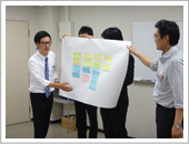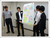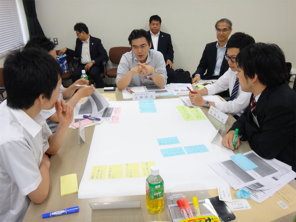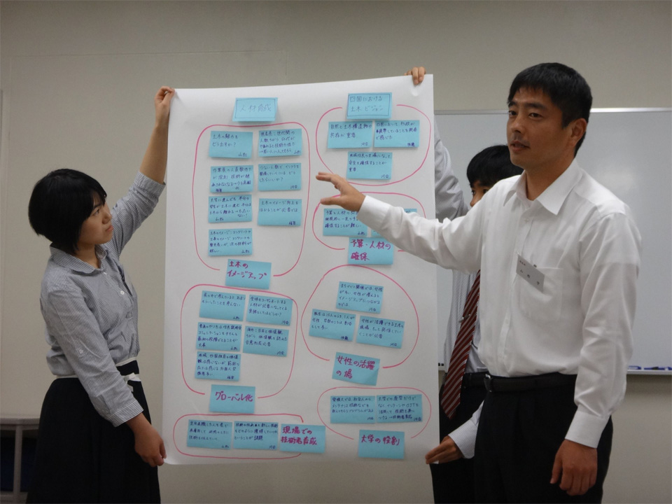 4名のファシリテータを含めて11名の若手技術者(20、30代各4名、40代3名)と9名(留学生、女子学生各1名)の大学院学生、合計20名の参加する中、最初に、「四国における土木の将来像と私たちの役割ー土木学会将来ビジョンを踏まえてー」と題した4件の話題提供がなされました。次に、4班に分かれてワークショップ形式で議論し、それぞれの班における議論の概要や感想等が発表されました。その後、磯部雅彦次期土木学会長より、ワークショップの議論を各自が深めることに大いに参考となる総括とコメントが行われました。